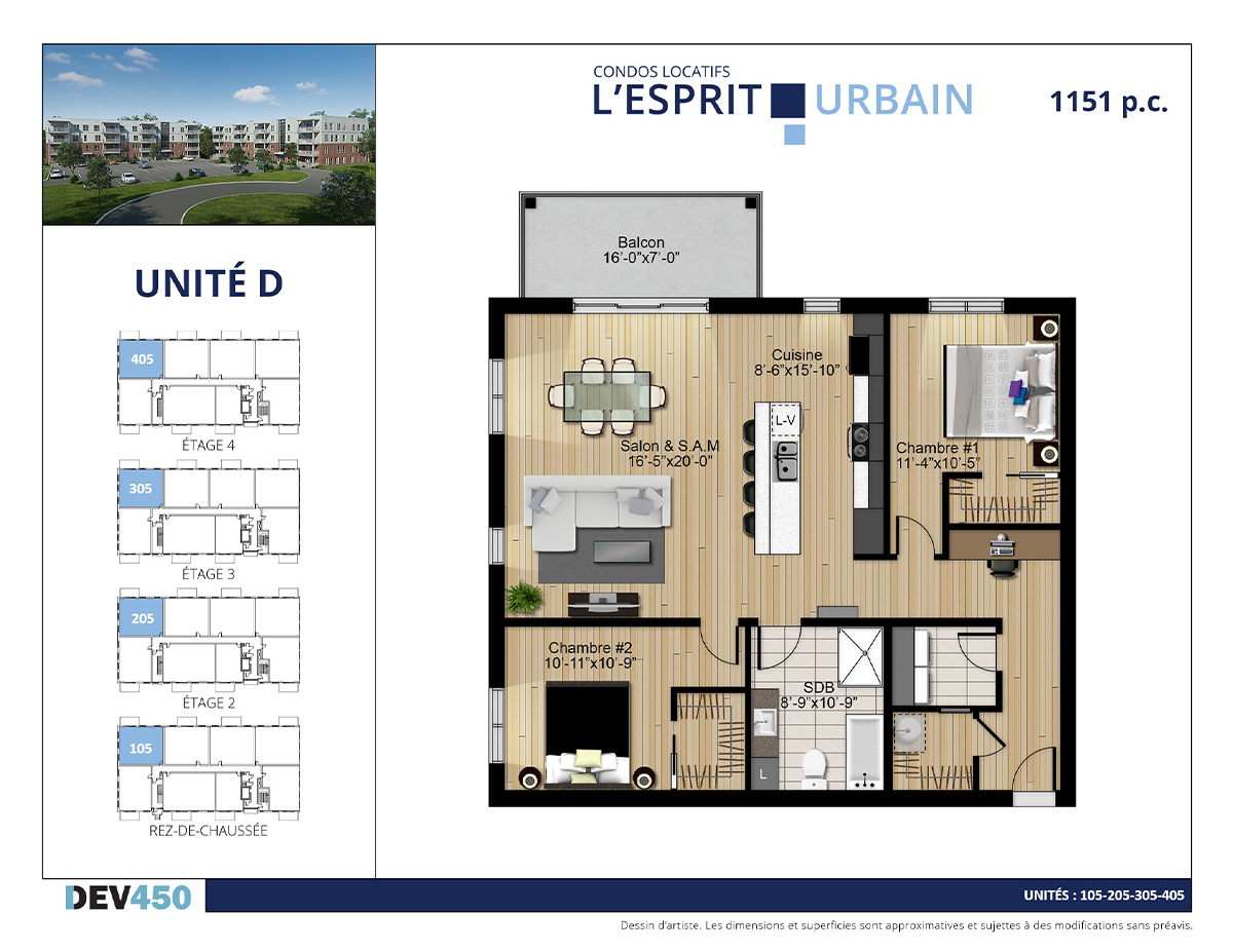 | 4 | D | 105 | Rdc | 4 1/2 | 1151 | Date à venir | Disponible | |